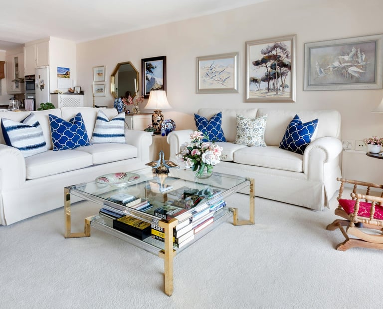 Elegant Living Room with Classic White Sofas and Blue Accents